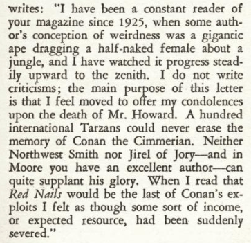Maybe more to the point, I think it’s worthwhile to read these attempts at carrying the torch forward in the post-Howard days of Weird Tales, particularly because they’re wrestling with something that would dog the genre well into today, namely: where do homage, tradition, pastiche, and out-and-out cribbing fit in the genre, and how do we push at the boundaries and make something new? Obviously there’s a deep love of Howard and his work here, but how do you build on it without simply (and more weakly) recapitulating the same tired old themes and plots and characters. I don’t think there’re answers in these stories, but I do think it’s fruitful to read them and think about these questions!