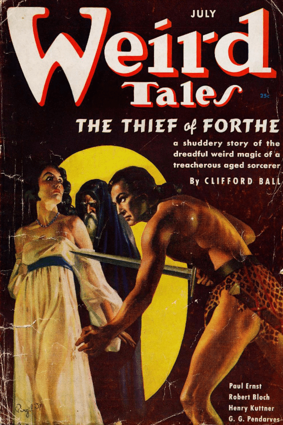 Since I broke the (cursed Lemurian) seal on it, why not continue to plumb the depths of Swordly & Sorcerous fiction that appeared in Weird Tales in the years immediately following Howard’s death? We talked Kuttner and Elak last time, focusing on the differences in character and approach between ol’ Hank and REH, so this time we’re going to look at an example of Post-Howard S&S that adheres a bit closer to the formula perfected by ol’ Two-Gun Bob. It’s Clifford Ball’s “The Thief of Forthe” from the July 1937 issue of Weird Tales!