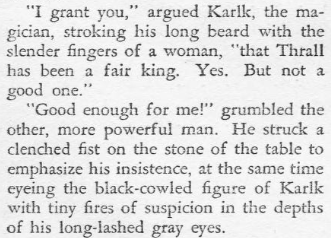 We’re introduced to a wizard with an apparently top-notch moisturization regime – their slender womanish hands a sure sign of sorcerous puissance and subtlety. This is in contrast to the other as-yet unnamed figure, who is immediately portrayed as a forceful, man’s-man kind of dude – he grumbles, he strikes the table with a meaty fist, and he’s suspicious of all this wizardly bandying of words about the King, named (oddly) Thrall. Yes, these two are surely quite different from one another, so much so that we get two more paragraphs describing them. First, our wizard: