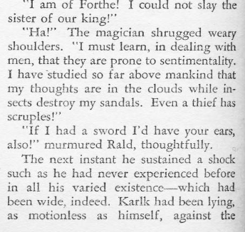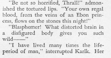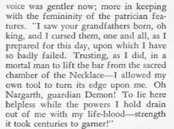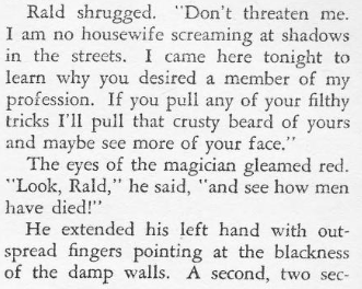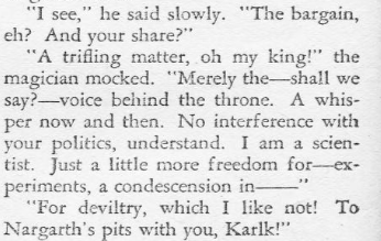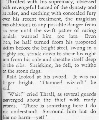 I love the whole “wizard practicing the blackest of sciences” angle to these early S&S stories – it’s something Howard did himself, with a lot of his evil wizards relying on drugs and alchemy and hypnotism more than thunderous bolts of power. Similarly, Kuttner had his weird little wizard Zend behaving more like a scientist, using occult forces and magic-technology to keep Atlantis from sinking, for instance. Karlk’s claim that they are merely a scientist is a lot of fun, and something that I feel like you don’t see as much of in fantasy these days – wizards are a lot more mystical and esoteric, which is a very different characterization from experimental and technical approaches to even blasphemous sorcerous knowledge.