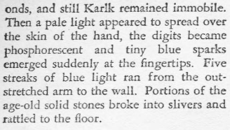There’s some fun back-and-forth arguing between Rald and Karlk about King Thrall; Karlk seems to have it in for in him, but Rald points out the King has done alright by Karlk, covering up a mishap when one of Karlk’s “experiments” escaped. All in all, Rald seems disgusted by the wizard and their planned treachery. I’m no business guy, but it really seems like at this stage of the negotiations (along in a dripping dungeon), you’d want to have this kind of stuff ironed out. Karlk seems put out by Rald’s apparent lack-of-fear; he is a weird, menacing wizard, after all, and is used to a modicum of cringing respect. So Karlk decides to show Rald some of his power: