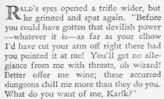 Also fun is how Karlk, while having to leave Rald behind, still proposes to honor their partnership – he’ll kill the people Rald can’t, and then Rald can become King, with Karlk the power behind the throne. It’s very logical and straightforward and, honestly, makes Karlk out to be even more inhuman and mysterious. Afterall, while he’s disappointed Rald didn’t just kill the Princess, he can still use him. It’s fun, weird, stuff, and honestly between that and the extra arms, Karlk is up there with the evil wizards in S&S lit, in my opinion.