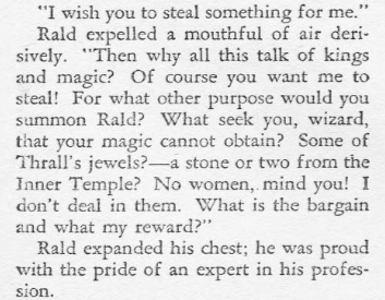 Rald’s professional pride is fun, as is his discussion of what the possible targets of his thieving might be. I like the little “No women, mind you!” bit too, it’s all very material and earthy, a lived-in detail that captures Rald pretty well and gives him a bit of depth.