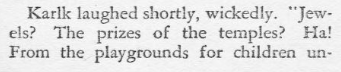 Again, it’s a really great part here that Karlk, a magician and therefore intimately familiar with the reality of occultic forces, couldn’t move the magical bar with its potent spell, so he hired an atheist thief to do it. That’s good, a solid interesting premise for a S&S story, and also an interesting “mechanic” (if you’re excuse the vulgarism) for a S&S world, where magical potency is in some way related to belief. It’s fun, and something you don’t see much of these days!