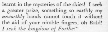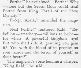 That is solid wizard shit there, you know what I mean? Kralk is steeped in black lore, and has moved beyond mere jewels and such. Kralk wants Rald to steal THE VERY KINGDOM ITSELF!!!! which is so bonkers, I love it. Rald’s reaction is fun too – how can you steal a whole kingdom, particularly one which is, in some way, divinely ordained. King Thrall is the King of Forthe, simple as? How would Kralk take over, even?
