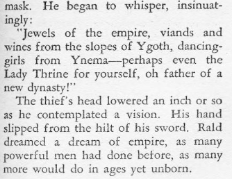 Very fun stuff; Rald is thinking about the Realpolitik of Kralk seizing the throne of Forthe, how impossible it would be to hold it given how everyone hates and fears him, but Karlk leapfrogs over that problem by the simple expediency of having RALD be the king, with Karlk a hands-off power behind the throne. Rald’s realization, and the temptation, are handled really well; Ball has constructed a convincing web for his Prince of Thieves to get enmeshed in!
