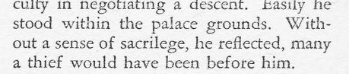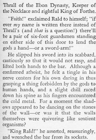 The next section opens on Rald beginning his infiltration of the Palace of Thrall. There’s some fun world building in here, among some admittedly clumsy and overwritten sentences. The walls of the palace, both inner and outer, are crumbling and in poor repair, and the patrols of the guards are fairly cursory and easily evaded. Similarly, the jagged bits of metal embedded at the top of the walls are rusty and easily pushed aside. But most importantly: