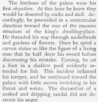 The statue he mistakes for a person, and the annoyance of the wet sandal are great, nice little bits of very realistic detail that lend Rald some interiority as well as highlighting his real physical experiences sneaking through the forbidden grounds. Equally fun is the fact that Rald knows the layout of the castle absolutely, due to the simple fact that everyone does, from servant’s gossip. The way Ball tells us that the simple peasants would be horrified at the use their gossip is being put to is fun writing. There’s a lot of nice details in this story, I think, and Ball is very much taking his time trying to develop the scene and evoke the setting, and it’s (largely) paying off, I think.
