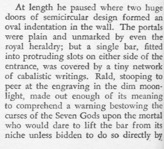 Might be a real “Marge_Potato.jpg” moment here, but look: I just think this is neat. It’s extremely fun that Rald is an atheist in a magical world with gods, and that it’s this atheism that allows him to lift the magically warded lockbar without being struck down by the mighty curse woven into its very matter. That’s good stuff, and it works nicely with the whole thing going on in this story – the decrepit theocracy being vulnerable to One Atheist Thief!