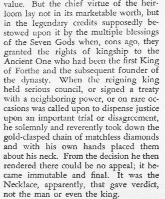So potent a symbol is this necklace that merely possessing it makes one, functionally and practically, the ruler of Forte. It might seem like a goofy system of gov’t, but who the hell am I, an Amerikkkan, to judge? More importantly, it’s in keeping with the whole tenor of this country/city-state, right? This religiosity that seems to rule here would absolutely imbue an object, and whoever happened to be holding it, with absolute political power; it makes sense! And it seems to have worked out just like Kralk imagined it would…or has it!? For, while Rald is admiring the sparkle of the diamonds that make up the necklace, he’s interrupted by a voice!