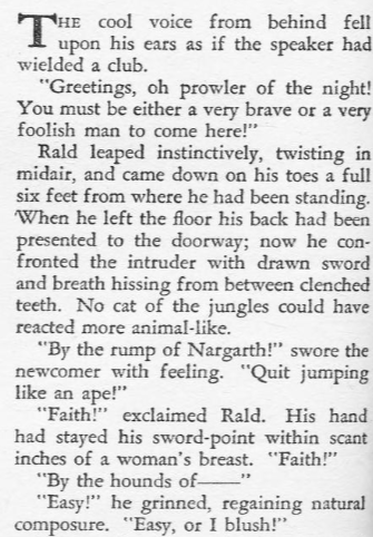 Ball thankfully (and correctly) drops the hints of “Chosen One” bullshit from his later (and last) two S&S tales, the much better and more fun Rald the Thief stories, the first of which we’ll be looking at today. But you should definitely temper your expectations here – they’re perfectly fine C-level work, I’d say, pastiches of what Ball obviously loved about Howard (and weird adventure writing), the sort of stories you expect from someone early in their writing career and looking for their voice. Unfortunately, Ball never got that chance – he wrote three more stories, though these are more straight weird fic than S&S. The last of these, a werewolf tale, was published in ’41, and then it appears Clifford enlists in the Navy. He ends up dying in, apparently, an accidental drowning in ’47, never having written anything else. It’s sad, especially because I think he had at least a sincere love of S&S, as I think you’ll see in the story today.