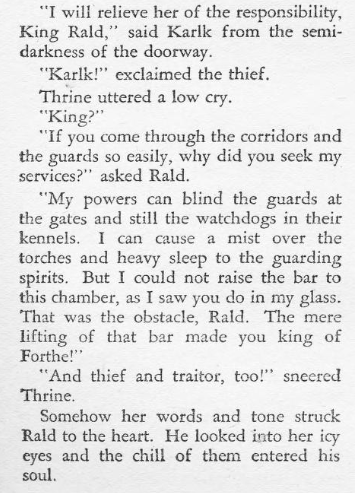 Thrine tells the king that Rald saved him, indeed saved them all from Karlk’s deadly magic, which the King grants, though of course he DID plan on seizing the throne himself. With a modicum of contrition, Rald foreswears his earlier actions: