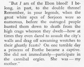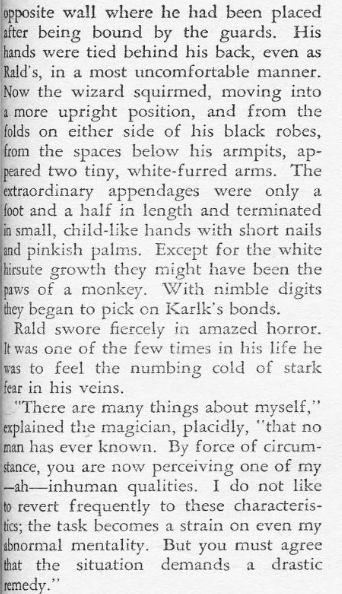 Kind of grim, and with an unfortunate amount of “monstrous ape rape” (a surprisingly popular theme in early Weird Fiction). Also, you might not recognize it, but the “white apes of Sorjoon” are basically the multi-armed white apes of Barsoom, from Burrough’s John Carter of Mars stories; in the earlier Duar the Accursed story, Ball refers to them as the white apes of the “hills of barsoom,” even. Maybe it was an editorial decision to change them, or perhaps he thought in hindsight that that was a little too on the nose. Still, everybody reading Weird Tales would’ve immediately recognized the Great White Apes for what the were, horrific multi-armed ape monsters from a classic swashbuckling sword-and-planet tale. It’s interesting that Ball uses them here; speaks to the importance of Burroughs for the readers of these more action-oriented, thrilling adventure weird tales, I think, and is in keeping with Ball’s letter eulogizing Howard too; he mentions “a thousand international Tarzans” as being unable to make up for the thrill and power of Conan, suggesting the lens through which he was being read, by some at least.