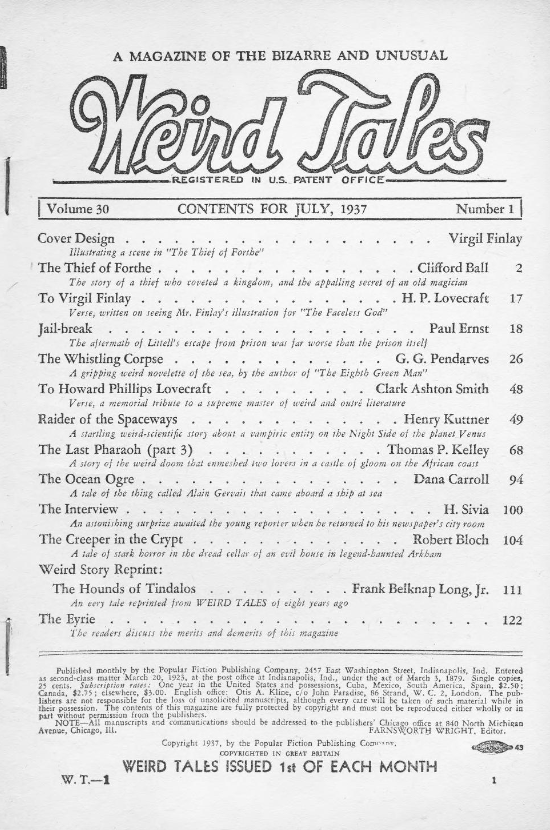 A good ToC, including a reprint of what’s probably Long’s most famous story, “The Hounds of Tindalos.” Also worth noting is CAS’s memorial poem to HPL, who had died in March of the year. It’s been a rough few years for Weird Tales fans, who’ve lost some giants in quick succession! Anyway, on to today’s tale!