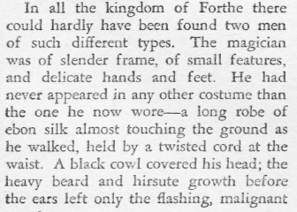 We’re introduced to a wizard with an apparently top-notch moisturization regime – their slender womanish hands a sure sign of sorcerous puissance and subtlety. This is in contrast to the other as-yet unnamed figure, who is immediately portrayed as a forceful, man’s-man kind of dude – he grumbles, he strikes the table with a meaty fist, and he’s suspicious of all this wizardly bandying of words about the King, named (oddly) Thrall. Yes, these two are surely quite different from one another, so much so that we get two more paragraphs describing them. First, our wizard: