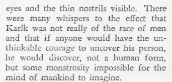 From a Sword & Sorcery perspective, I think this story is pretty decent. There’s good world building, and Karlk is a fun and interesting character that, honestly, I would’ve liked to spend more time with. Rald is basically and blandly a species of Conan, though maybe just that much more avaricious than the original – like I said, working with an obviously evil wizard seems a bit too much for ol’ Conan, though Rald readily agrees (even if he does have second thoughts later).