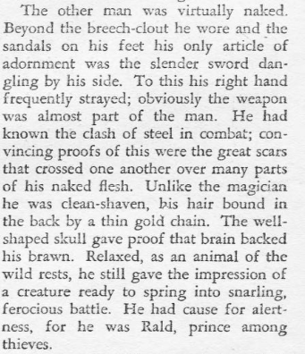 No mincing words here, this is just Conan. Naked and muscular in a loincloth and sandals, obviously of a kind with the Cimmerian, strong, violent, and cunning (as evidenced by phrenology). What is interesting is that Ball calls out Rald’s scars, which is a detail I don’t think I’ve read about in Howard’s loving descriptions of Conan’s rough-and-rugged body. Ball wants to highlight the history of macho violence embedded in Rald’s body, because this, along with his near-nakedness, muscular bigness, and clean-shaven face, marks him as diametrically opposed to Karlk the Magician.
