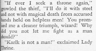 Again, it’s a really great part here that Karlk, a magician and therefore intimately familiar with the reality of occultic forces, couldn’t move the magical bar with its potent spell, so he hired an atheist thief to do it. That’s good, a solid interesting premise for a S&S story, and also an interesting “mechanic” (if you’re excuse the vulgarism) for a S&S world, where magical potency is in some way related to belief. It’s fun, and something you don’t see much of these days!