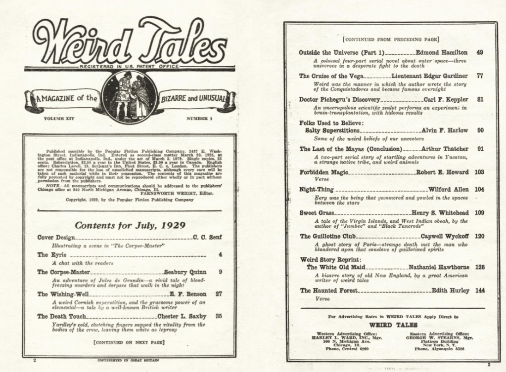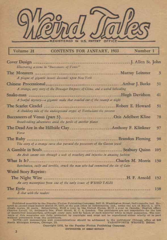 The next issue, Jan 1937 v. 29 n.1, opens with Wright reflecting on the “necrology” of Weird Tales: