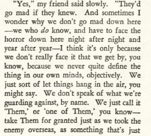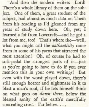 The Lovecraft excerpt is a pretty important one, I think, and sort of sets the tone for the way Howard has entered the annals of weird literature. His line about Howard having “put himself into everything he wrote” is key, and a point HPL would make over and over (it forms the center of the long in memorium he wrote for the fanzine Fantasy in their Sept 1936 issue too). The idea that Howard was deeply engaged with his writing, producing art even in spite of the commercial conditions, is high praise from someone like HPL. Too, I think both he and REH shared a deep appreciation for their roles as REGIONAL authors, people interested in their specific environments and backgrounds and what it meant for them as both people and writers. And there’s certainly something to HPL statement that Howard had a “unique inner force and sincerity” in his work – read Kuttner’s Elak story or Ball’s Rald stories and tell me that, no matter how fun and possibly good they are, there IS certainly something missing from them.