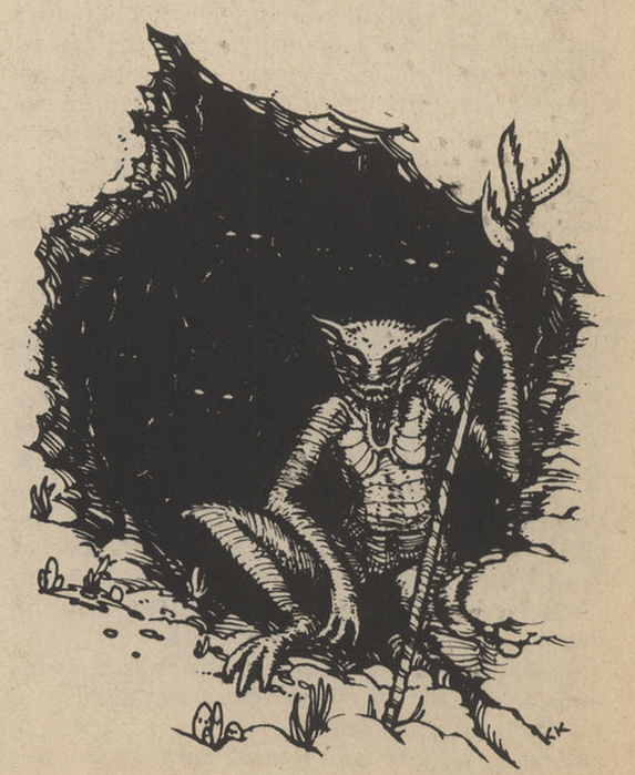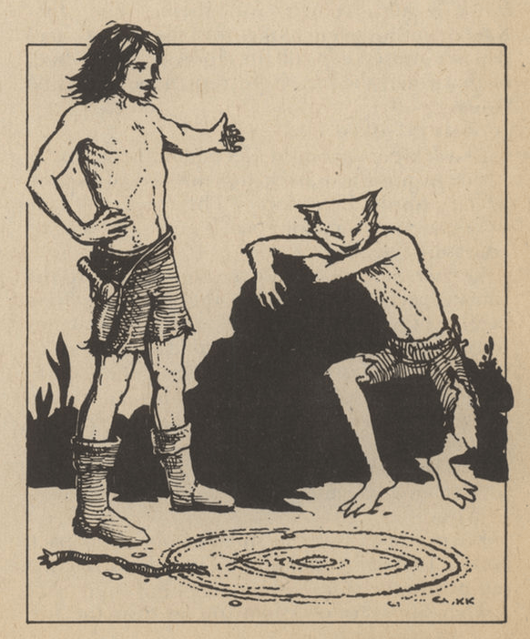 Good, strange wizard physiognomy, I think, and the insanely hairy face is fun (and, obvious) foreshadowing of something. The “what’s under those robes!?” is a little thickly ladled on here, but honestly it’s not too bad, and it’s perfectly fine to hammer it home given where the story will end up. “Karlk” is a decent evil sorcerer name too, I think, short and sharp and menacingly strange. All in all, a top-tier evil magician, I think. And what’s the beefy fellow Karlk has been talking to like, you ask? Well: