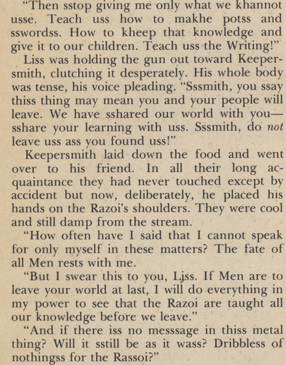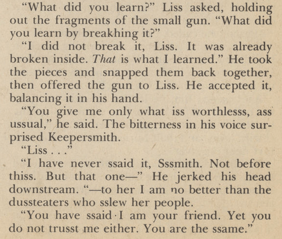 It’s also menacing as hell, isn’t it? We had that little story about the dog-man thing that had to be executed after it escaped, a very strange and unsettling story, and Karlk seems to be mostly interested in being allowed to expand his research program, something that would necessitate a friendly king willing to turn a blind eye to whatever horrors he’s planning. Of course Rald is disgusted…but…