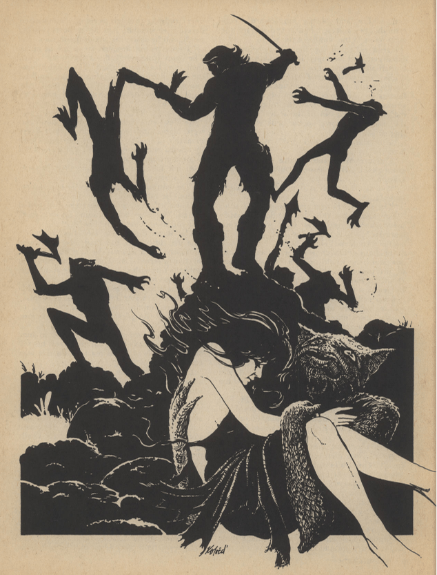 Anyway, Kalrk prepares to zap Thrine, something the besotted Rald CANNOT ALLOW TO HAPPEN…but it’s all put on hold by the arrival of King Thrall, in full battle armor. There’s a funny bit where Rald, again in Mouser fashion, asks exasperatedly “doesn’t anybody SLEEP in this castle?” which is a funny, solid joke for a S&S story. There’s more banter, some guards show up, and the Kralk and Rald are bound up with ropes. They’re left, unguarded, in the council room (with the necklace) while Thrall, having sent his sister back to her room, orders a quick search of the gardens, in case there are more conspirators. Left alone, Rald and Kralk bicker a bit, with Karlk realizing that Rald has scruples he hadn’t imagined.