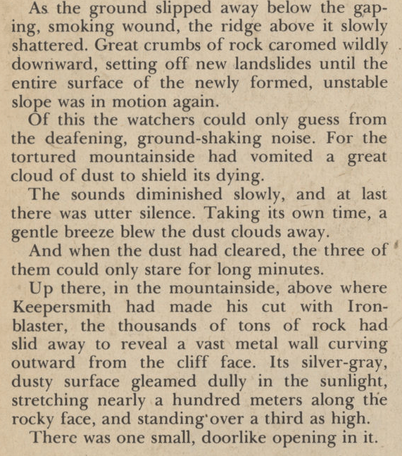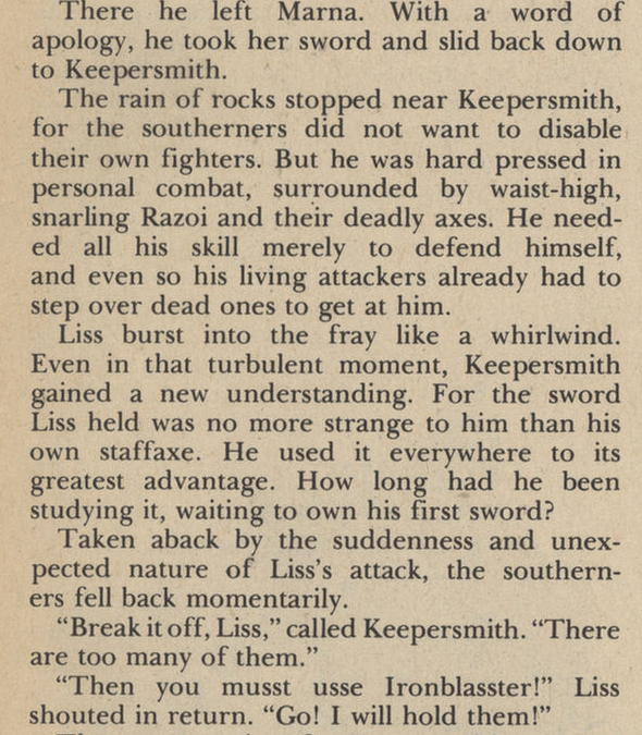The next section opens on Rald beginning his infiltration of the Palace of Thrall. There’s some fun world building in here, among some admittedly clumsy and overwritten sentences. The walls of the palace, both inner and outer, are crumbling and in poor repair, and the patrols of the guards are fairly cursory and easily evaded. Similarly, the jagged bits of metal embedded at the top of the walls are rusty and easily pushed aside. But most importantly: