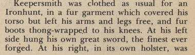 Again, it’s a really great part here that Karlk, a magician and therefore intimately familiar with the reality of occultic forces, couldn’t move the magical bar with its potent spell, so he hired an atheist thief to do it. That’s good, a solid interesting premise for a S&S story, and also an interesting “mechanic” (if you’re excuse the vulgarism) for a S&S world, where magical potency is in some way related to belief. It’s fun, and something you don’t see much of these days!