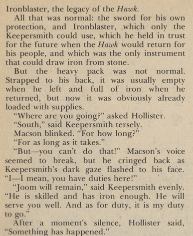 We’re introduced to a wizard with an apparently top-notch moisturization regime – their slender womanish hands a sure sign of sorcerous puissance and subtlety. This is in contrast to the other as-yet unnamed figure, who is immediately portrayed as a forceful, man’s-man kind of dude – he grumbles, he strikes the table with a meaty fist, and he’s suspicious of all this wizardly bandying of words about the King, named (oddly) Thrall. Yes, these two are surely quite different from one another, so much so that we get two more paragraphs describing them. First, our wizard: