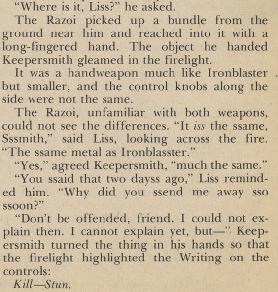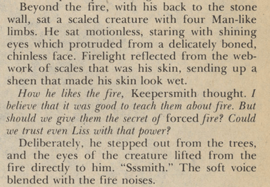 The newcomer is the King’s sister, the Lady Thrine (apparently a real, if rare, Danish girl’s name, by the way), and she’s aghast at the temerity of Rald to not only break taboo by touching (and proposing to steal) the Sacred Necklace, but also by DARING to enter her bedchamber and peer at her sleeping. Yes, she was the “courtesan” from earlier, and its the whole shock of the boldness of Rald’s crimes that have lead her here, rather than, say, calling out all the guard. There’s some flirty banter, honestly not badly done, particularly since Ball is working on his own here in a Pre-Mouser world, but it’s cut short by the sudden arrival of Karlk!