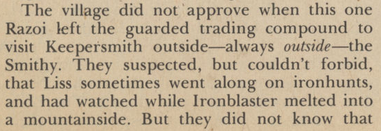 The next section opens on Rald beginning his infiltration of the Palace of Thrall. There’s some fun world building in here, among some admittedly clumsy and overwritten sentences. The walls of the palace, both inner and outer, are crumbling and in poor repair, and the patrols of the guards are fairly cursory and easily evaded. Similarly, the jagged bits of metal embedded at the top of the walls are rusty and easily pushed aside. But most importantly: