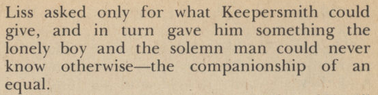 Of course, we haven’t actually learned their names yet, although that’s not too far off in this story. Still, they’re very well developed and, for the most part, fully formed, the same characters that we’ll meet in their future adventures – this is due to the fact that Leiber, with his friend Harry Fischer (who actually created and named Fafhrd and the Gray Mouser, basing them off of Leiber and himself) had been exploring the two and their world for several years already. Leiber in fact had already written several of their adventures already, and that background had practice has given Leiber a good handle on these two.