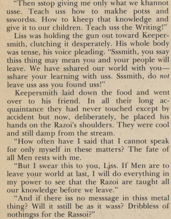 It’s also menacing as hell, isn’t it? We had that little story about the dog-man thing that had to be executed after it escaped, a very strange and unsettling story, and Karlk seems to be mostly interested in being allowed to expand his research program, something that would necessitate a friendly king willing to turn a blind eye to whatever horrors he’s planning. Of course Rald is disgusted…but…