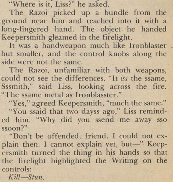 The newcomer is the King’s sister, the Lady Thrine (apparently a real, if rare, Danish girl’s name, by the way), and she’s aghast at the temerity of Rald to not only break taboo by touching (and proposing to steal) the Sacred Necklace, but also by DARING to enter her bedchamber and peer at her sleeping. Yes, she was the “courtesan” from earlier, and its the whole shock of the boldness of Rald’s crimes that have lead her here, rather than, say, calling out all the guard. There’s some flirty banter, honestly not badly done, particularly since Ball is working on his own here in a Pre-Mouser world, but it’s cut short by the sudden arrival of Karlk!