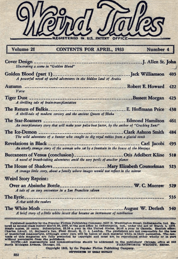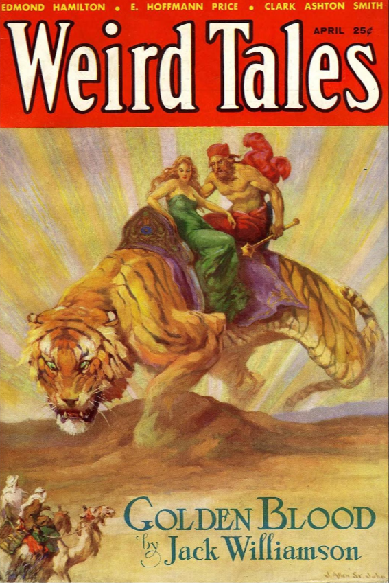 This month’s cover, by J. Allen St. John, isn’t particularly weird, unfortunately, although I like the snarl on that giant ass tiger’s face. Very orientalist, something that editor Farnsworth Wright (and the readership of Weird Tales) loved with a fierce undying passion, so it makes sense that Williamson’s “Arabian” style multi-part novel would be made the cover. Still, c’mon man – gimme a monster!