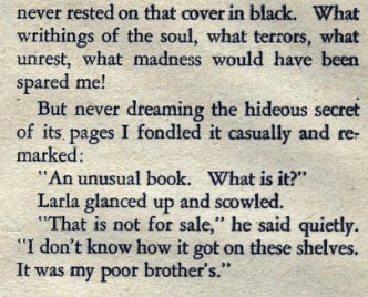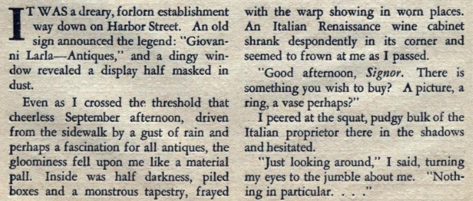 Our story opens with a narrator battling his seasonal affective disorder by going antiquing. What’s funny is that our dude exchanges a dreary rainy day for what is, apparently, an equally dreary shop – the description of the wine cabinet shrinking despondently into its corner is a good bit o’ writing that sets the tone for Larla’s shop, I think. Our guy’s not after anything in particular, of course, but Larla is COMMITTED to his pitch, and even after the narrator suggests he’d like to see some books, Larla makes him go through the whole shop, looking at furniture, paintings, a “muddle of yellowed statuettes,” all kinds of junk. But, eventually, they reach the Old Books in the back.