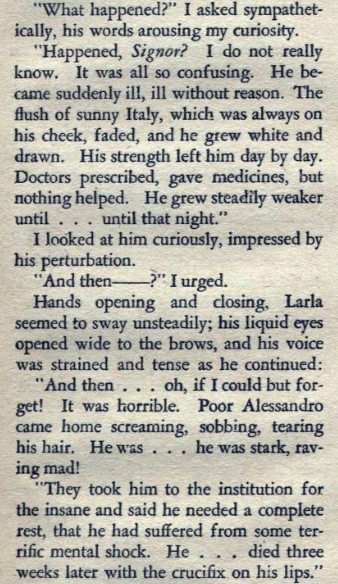 Am I a sucker for the “last ravings of lunatic” macguffin? Yes, and so is our narrator – when he learns it was written BY a guy IN an asylum, he wants it EVEN more badly. Larla explains the Sad Tale of his Brother, Alessandro: