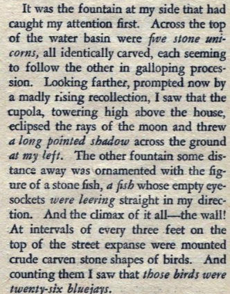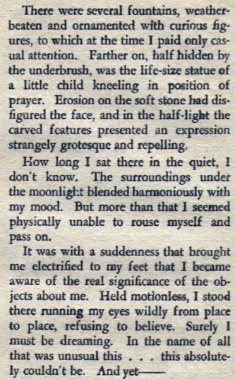 This story, while very *classical* in format and execution, is still awfully evocative and atmospheric; Jacobi is great at scenes and environments, and I like the way in particular he describes the moonlit garden and the fountain. Apparently, this was a view shared by the editor of Weird Tales Farnsworth Wright – he originally and very firmly rejected this story, only to contact Jacobi a few weeks later to ask if he could publish it! Our narrator discovering the garden had stuck with ol’ Wright, so much so that he’d found himself thinking about that scene long after he’d rejected the story.