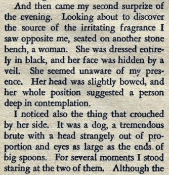 Fun bit of subtle weirdness here – she’s obviously the author of the “feminine hand” that our narrator spotted on the frontpiece of the book, but there’s an implication here that, somehow, the book and she are intimately and causally connected. It could just be dissembling on her part, of course, but it really seems like our guy reading the book has summoned both Him and Her to the garden, together, some kind of weird link being forged between them by the reading of the story. It’s good and interesting, and I don’t think I’ve ever seen anything like it with regards to vampires – the idea that they’re associated with some kind of cursed object like that is neat!