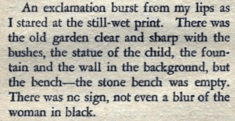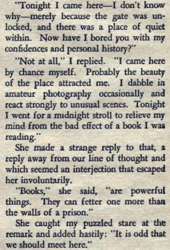 The next day finds out guy increasingly preoccupied with Perle and the garden and the books of Larla. He describes himself as addicted to the mystery of the thing, and can’t help but go back to the shop where, despite not returning the first book, he procures the second volume at another ridiculous price. He rushes home, reads it, but the mystery merely deeps for him, and his weird craving to return to the garden grows stronger and stronger. He tries to resist it, to ignore it, but then, in a flash he has the sudden idea that the garden scene and her and all that moonlight would make one hell of a picture, something he could even submit to the International Camera Contest in Geneva next month! Is that a delusion on his part, or an excuse? Regardless, our shutterbug grabs his fancy camera with its newfangled flashbulb and hustles on out to the garden again.