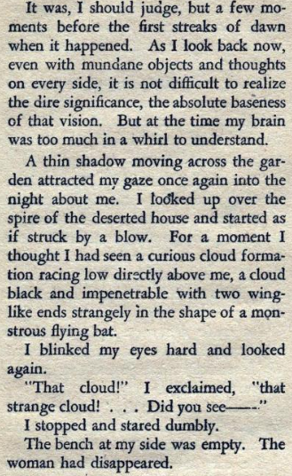 Anyway, our dude spends the whole night talking to this lady in the garden. He’s obviously enchanted by her, even if he has a mounting sense of unease the whole time…why won’t she remove her veil, for instance. Then, just as the night gives way to dawn, something weird (well, weirder) happens!