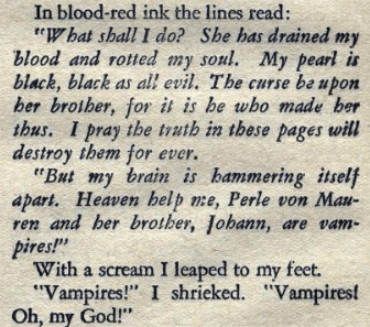 She’s there, of course, and they chat for a long while – she seems weirdly reticent to talk about her brother, and yet simultaneously compelled to tell our narrator about him. There’s an interesting section of his time as a student in Vienna where, as is traditional, he’s considered a weird and potentially dangerous avant garde philosophy student with odd and offputting ideas. His experiences in the war, and in digging graves as a prisoner of war, seem to be a particular focus of her morbid interest. It feels like this is Jacobi gesturing towards an underutilized bit of Vampire Lore here, the idea that a vampire rises out of the grave of a sorcerer. Her brother’s background as a “weird philosophy” student matches that, and she also seems to be suggesting that his terrible experiences in the war somehow “tainted” his soul.