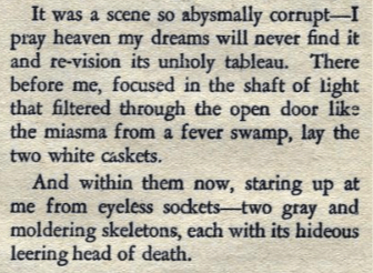 He won’t be a victim, not like Larla! He smashes the legs of his tripod to make two sharp stakes and takes a taxi IN THE DAYTIME over to the house. Inside, he finds a room with coffins and the cloying, masking odor of Heliotrope…and does what needs to be done.