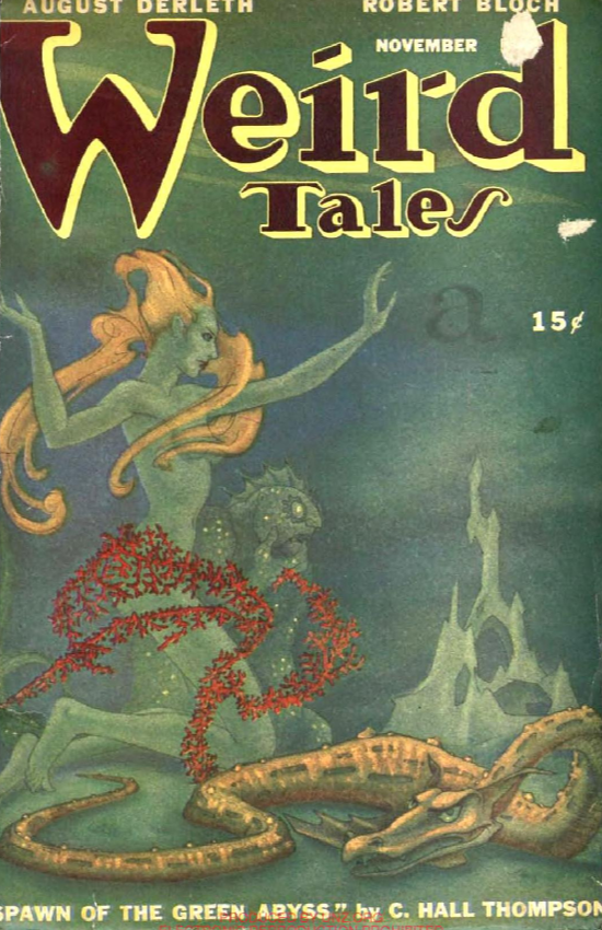 Solid ToC this time – the real highlight is the Smith story, “Mother of Toads,” which is a classic. But there’s Bloch on here, Gans Field (aka Manly Wade Wellman), a Price reprint, posthumous verse from Lovecraft and Howard… even the Quinn here is better than his usual stuff (i.e., it’s not a Jules de Grandin story). All in all a solid late Wright issue, I’d say!
