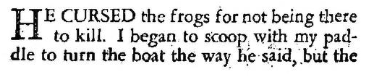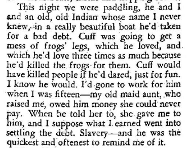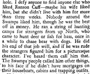 Cuff and his unfortunate cronies are out paddling around the swamp, looking for frogs to gig and havin’ a hell of a time of it – there doesn’t seem to be any frogs along the banks. Cuff, angry and frustrated, orders his men to paddle him up to a secluded neck of the swamp that he’s never been in before, but where he can hear the frogs calling. Our narrator starts paddling, but his comrade pulls his paddle from the water and stops the boat.