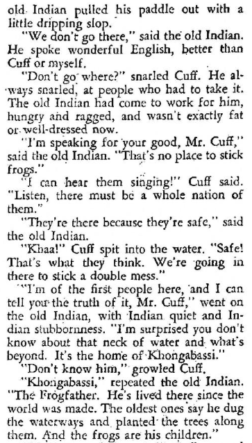 Another nice little glimpse of weirdness there: Frogfather would “have a way to deal with” a lot of people, if they were to go in there and try and do something about him, and buddy, you don’t wanna see what that would be! It’s another well-executed classic bit of weird fiction, where there’s a *hint* or something much stranger at work. Some dude comes in and starts killing frogs where he isn’t supposed to, well, that calls for the Frogfather just comin’ up and grabbing the guy. But a more complicated kind of incursion, with more people and boats and suchlike…well, that would mean the Frogfather would be forced to do something a bit more dire. Great, great stuff.