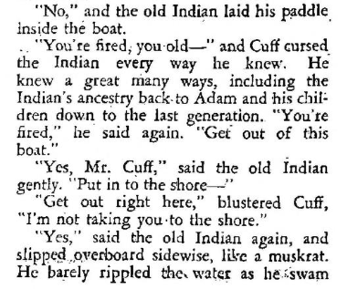 Of course, Cuff can’t believe what he’s hearing – he don’t give a shit about Frogfathers, he wants some extra-cruelty supper, and he wants it now! He tells the nameless Indian to shut up and get paddling, which, of course, the nameless Indian refuses to do.