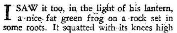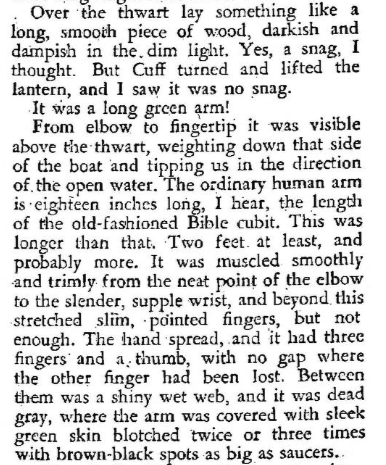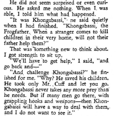 I like the description of the Big Frog here – the line about the eyes being “every jewel-flashing color known to the vainest woman” is both fun and shows Wellman’s ear for backwoods eloquence. The neat thing, too, about the Frogfather is that it’s purely the size and bulk of the thing that’s alien; other than that it is, simply, a Big Frog, and honestly that’s something I appreciate. There’s no reason for this thing to be some kind of eldritch abomination, or even something “frog-like” akin to Clark Ashton Smith’s Tsathoggua – this thing, which has some mythic, folkloric, primal linkage to frogs and their lives, appears as a truly big frog, simple as. I think that makes the weirdness of its actions, in the section above and what we’ll see in a bit down below, all that much weirder, too. It heaves itself up onto the boat, casually snaps Cuff’s iron gig, and then tips the boat, grabbing Cuff by the head and neck – the monstrousness of the Frogfather is in the incongruity of its very deliberate, almost human-like, actions.