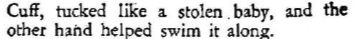 Pretty brutal frog murder there, isn’t it? The gaping mouth, the smacking it alongside the boat to make it stop its squirming, grim stuff. Cuff’s bloodlust is up now – he sees another one and wants more! But, as they’re trying to maneuver towards it, the boat starts to wobble and tip. Cuff curses Johnny, and tells him to hold the boat steady. Johnny says he IS holding the boat steady, it’s Cuff in the prow that’s causing the imbalance, which, of course, Cuff denies. Must be a snag, Johnny figures; he takes the lantern and peers over the side of the boat, trying to spot whatever it is they’re caught up on.